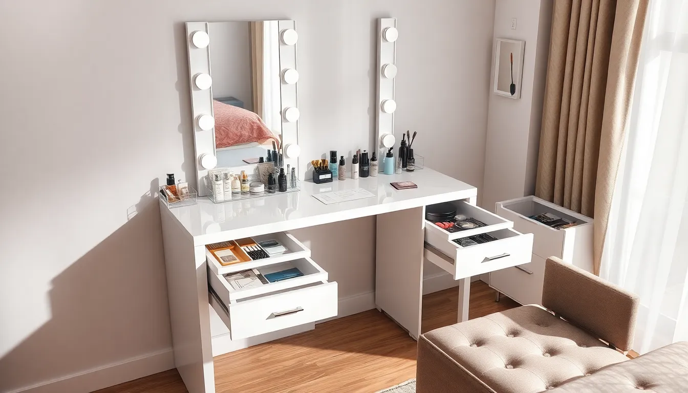 Combination furniture pieces serve double duty in cramped quarters where separate items aren’t practical. These versatile units function seamlessly as workspaces during the day and beauty stations during morning and evening routines.