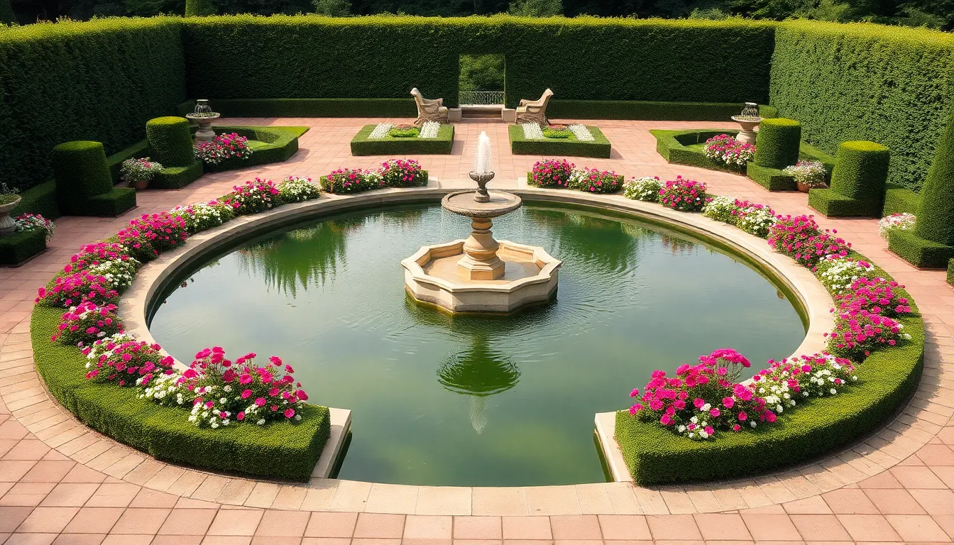 Flower arrangements should follow geometric patterns with plants arranged in straight lines or perfect curves that mirror the pond’s shape. Precisely placed specimen plants like ornamental grasses or flowering perennials create visual interest without disrupting the formal design’s clean lines. Plant heights should graduate systematically from the pond’s edge outward to maintain sight lines and visual balance.
