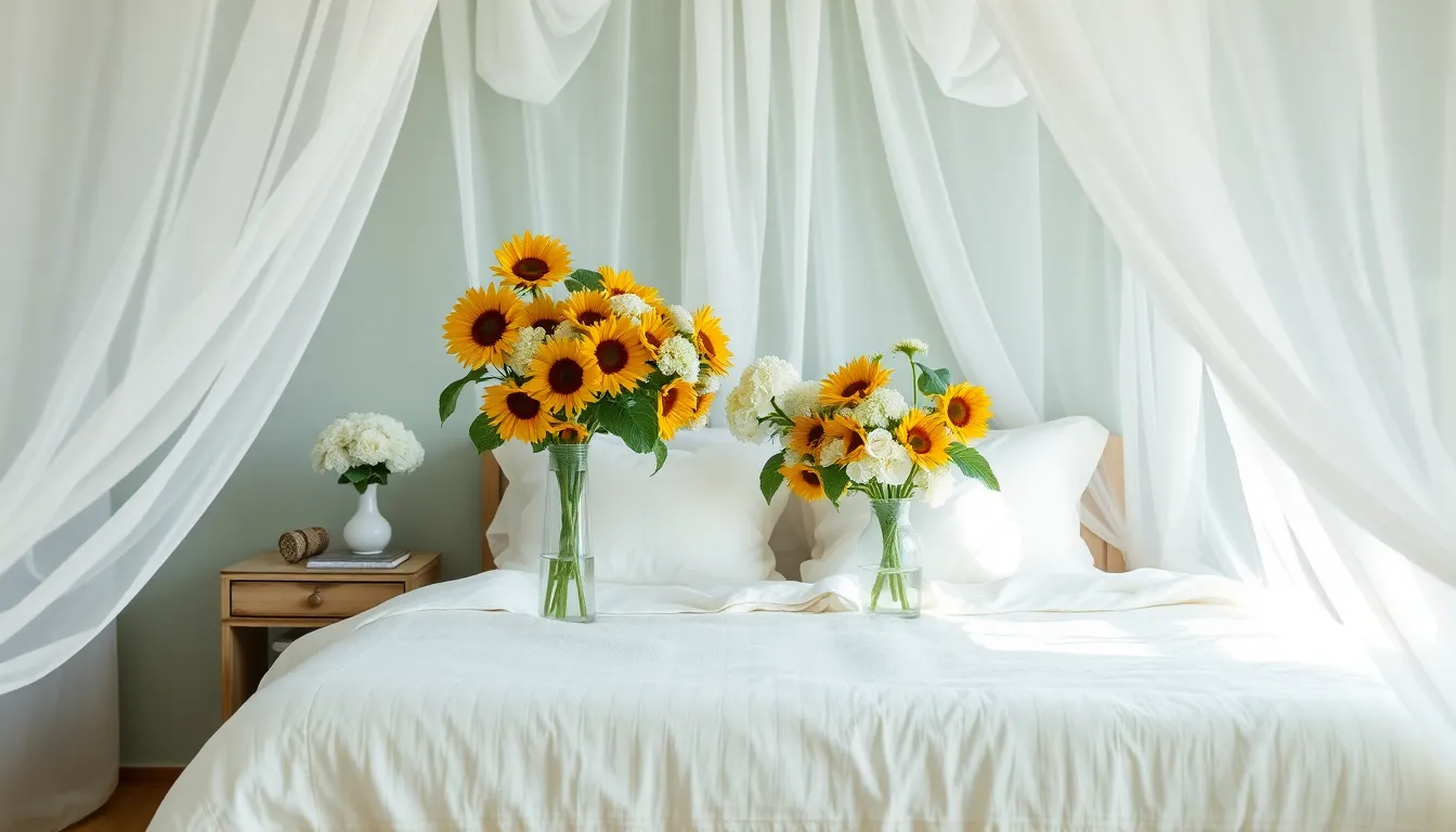 Fresh flowers in vintage vases bring natural beauty and delightful summer scents into your bedroom space. Choose seasonal blooms like sunflowers, hydrangeas, or white roses that complement your established color scheme.