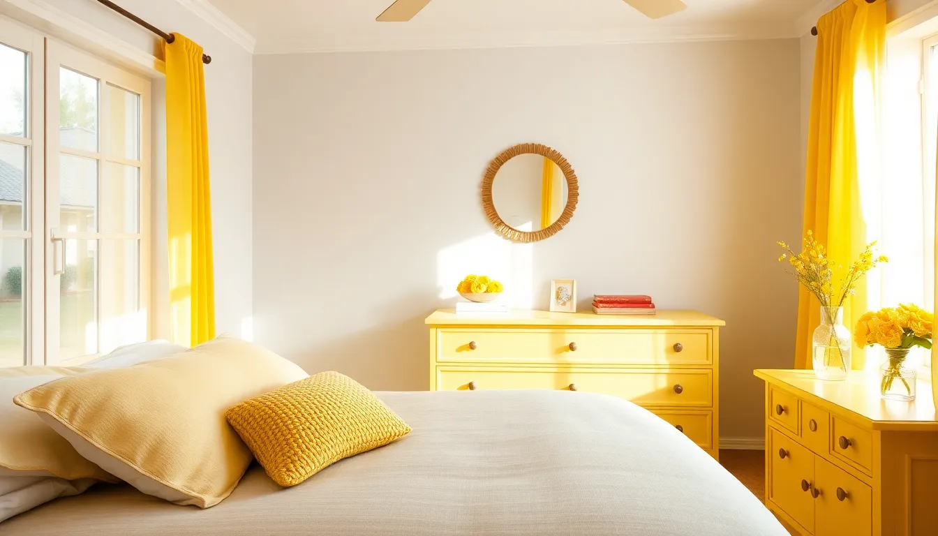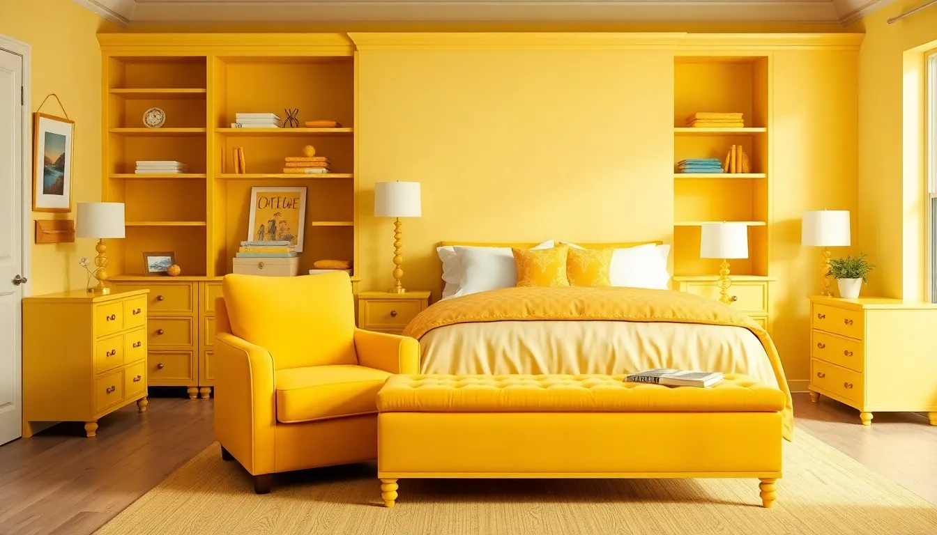 Transforming bedroom furniture with yellow elements creates functional storage while maintaining the vibrant aesthetic we’ve established. These strategic furniture choices seamlessly blend practicality with the sunny color palette throughout your space.